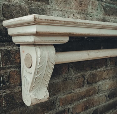 The shelf features intricate hand-carved accents that showcase the skill and artistry involved in its creation, adding a unique, antique charm.